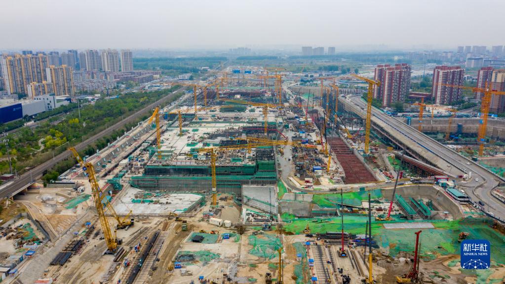 這是在北京市通州區拍攝的建設中的北京城市副中心站綜合交通樞紐(2023年4月23日攝,無(wú)人機照片)。