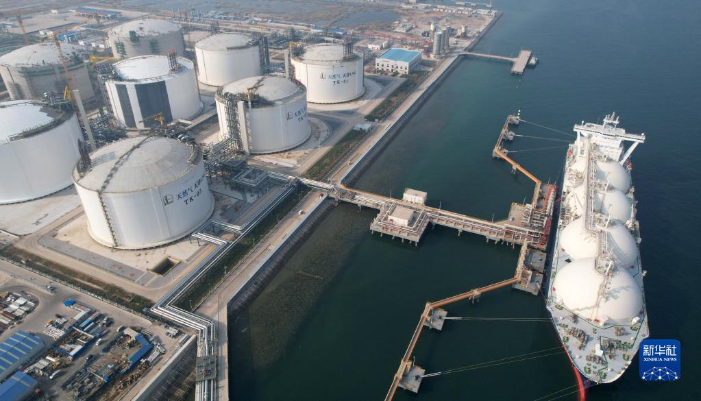 一艘液化天然氣運輸船靠泊在中國石化天津LNG接收站“1號泊位”進(jìn)行卸船作業(yè)(2022年10月21日攝,無(wú)人機照片)。