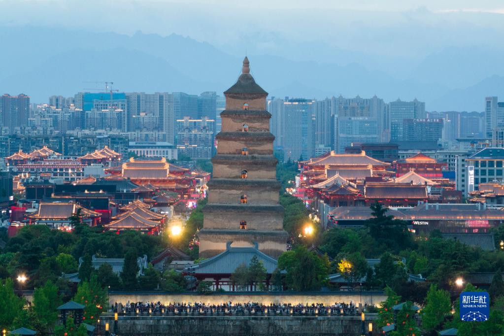 西安大雁塔及其身后的大唐不夜城街區(5月8日攝)。
