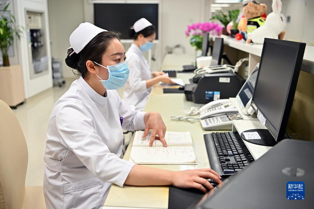 5月11日6時(shí)許,北京協(xié)和醫院基本外科四病房護士李婷(前)在書(shū)寫(xiě)護理記錄并錄入電腦;李美宣在檢查護理記錄并蓋簽名章。