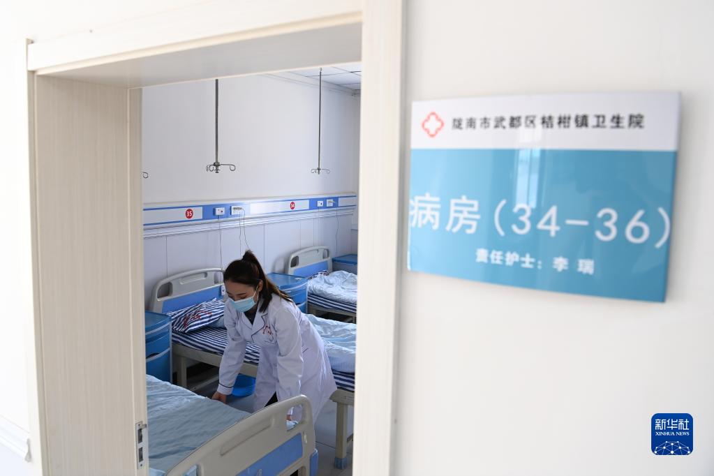 在武都區桔柑鎮衛生院住院部病房,李瑞在整理患者床鋪(5月11日攝)。