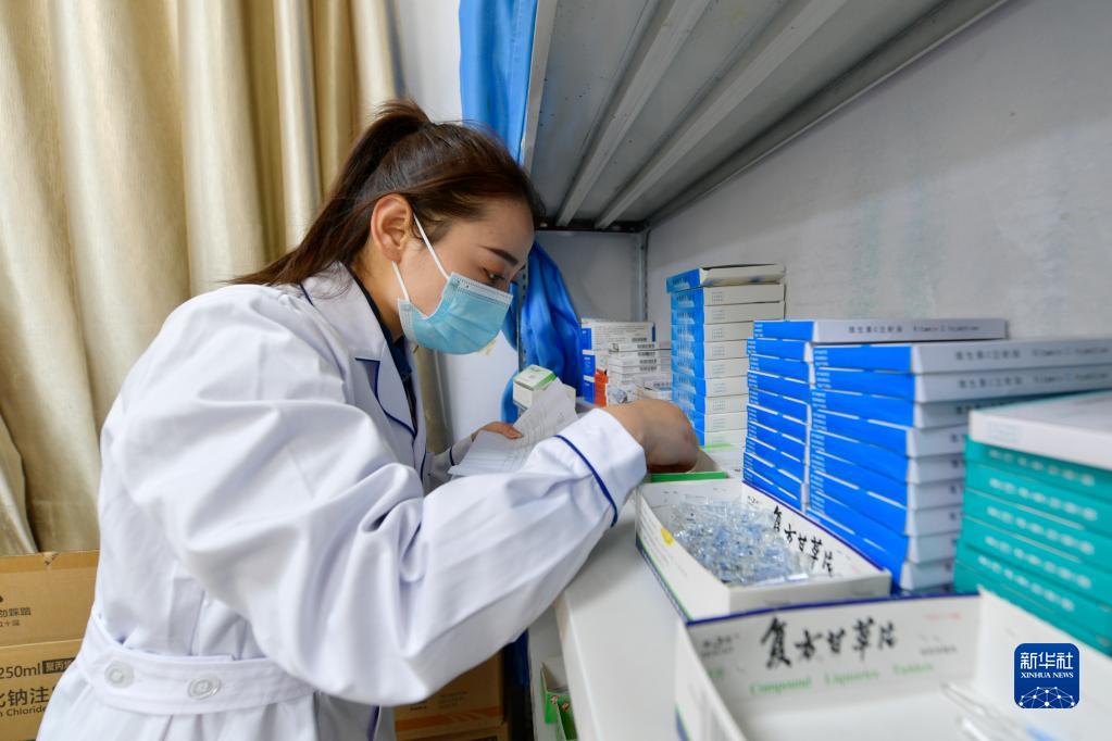 在武都區桔柑鎮衛生院藥房,李瑞為住院患者取藥(5月11日攝)。