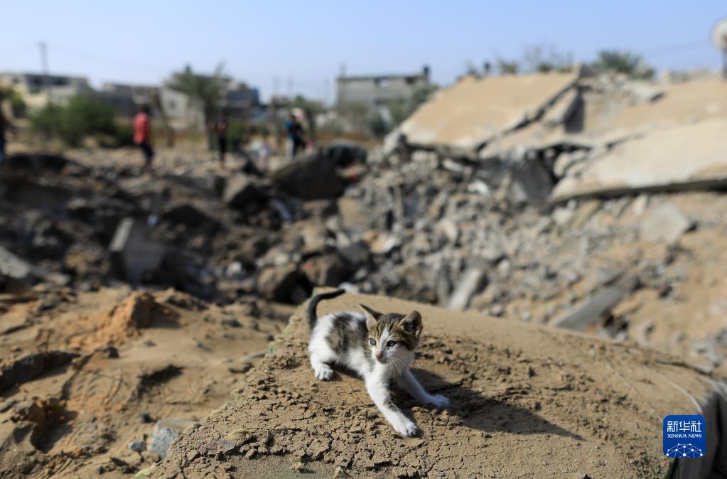 5月11日,在加沙地帶汗尤尼斯,一只小貓趴在空襲過(guò)后的建筑廢墟中。