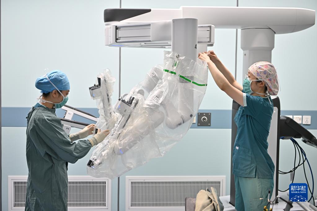 5月11日8時(shí)許,北京協(xié)和醫院手術(shù)室護士王輝(右)和護士崔新冉為達芬奇機器人臂安裝無(wú)菌罩。