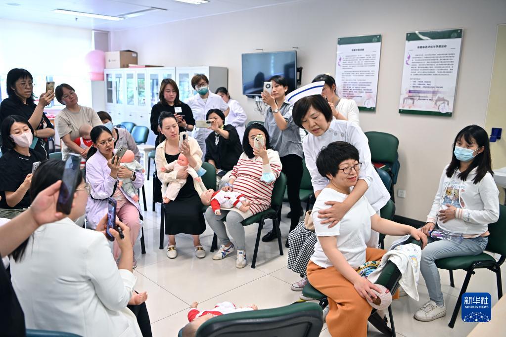 5月9日11時(shí)許,北京協(xié)和醫院產(chǎn)科門(mén)診護士長(cháng)李蕊(著(zhù)護士裝者)在孕婦學(xué)?;顒?dòng)中與來(lái)院交流的產(chǎn)科醫護人員及孕婦交流護理技巧。