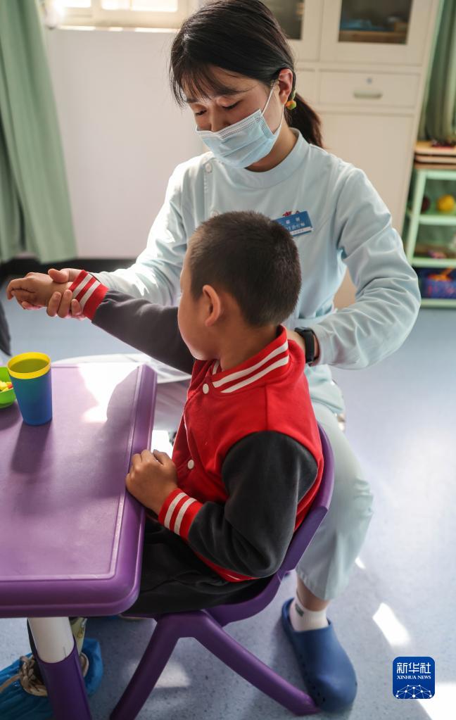 5月11日,康復治療師在渭南腦病康復醫院幫助患兒進(jìn)行上肢被動(dòng)訓練。