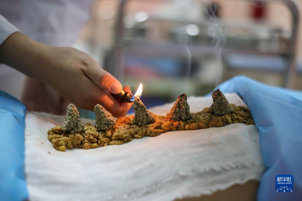 5月8日晚,渭南腦病康復醫院的一名護士在為患兒進(jìn)行督灸治療。