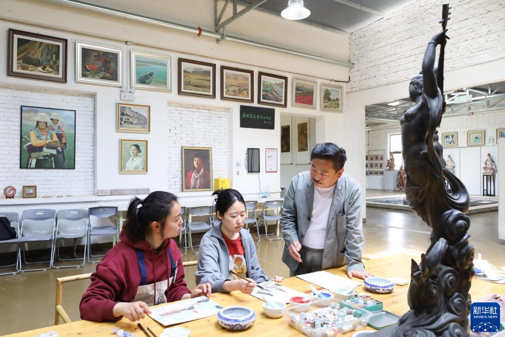 5月11日,敦煌彩塑制作技藝非物質(zhì)文化遺產(chǎn)傳承人杜永衛(右)在位于敦煌市的莫高里工匠村給學(xué)員教授繪畫(huà)技法。