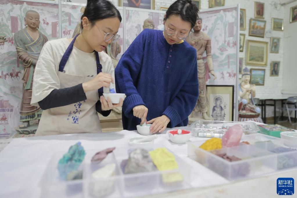 5月11日,學(xué)員在位于敦煌市的莫高里工匠村用天然礦石制作顏料。
