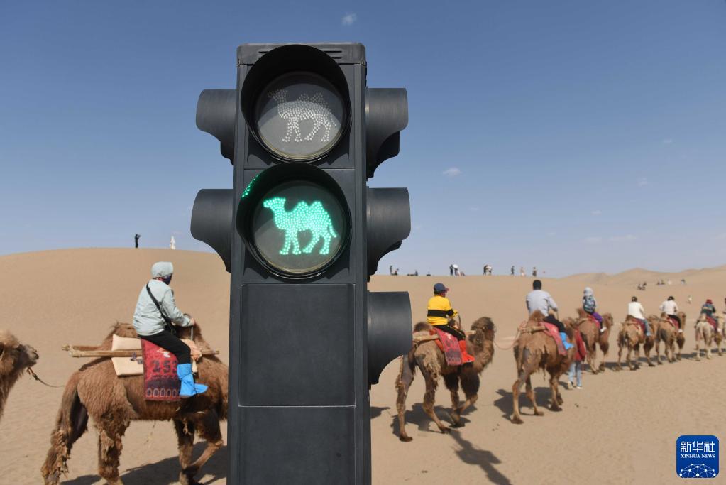 5月11日,在鳴沙山月牙泉景區,游客乘坐的駱駝隊根據“駱駝紅綠燈”有序通過(guò)路口。