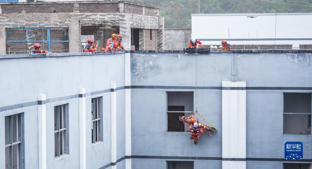 安順消防救援支隊隊員在進(jìn)行高空救援演練(5月11日攝)。