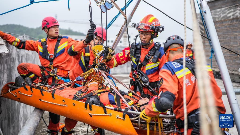六盤(pán)水消防救援支隊隊員在轉運“受傷人員”(5月11日攝)。