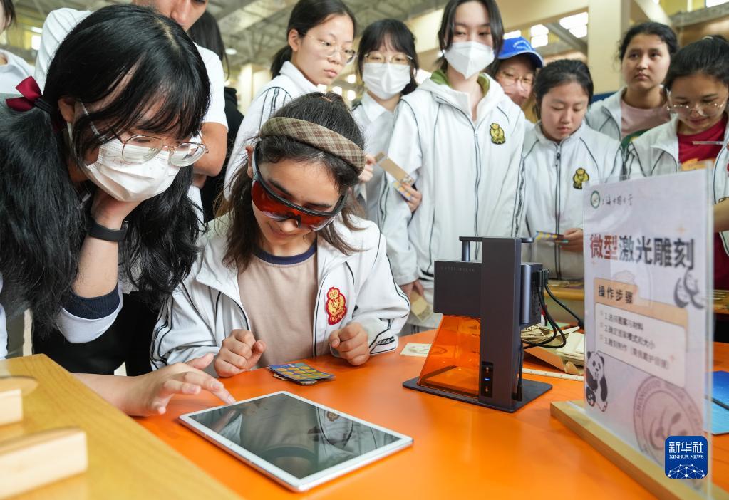 當日,上海市位育中學(xué)開(kāi)展校園科技活動(dòng),為學(xué)生們帶來(lái)一場(chǎng)“科技大集”。學(xué)生們通過(guò)體驗微型激光雕刻、觀(guān)看機器人演示等科教活動(dòng)感受科技魅力。