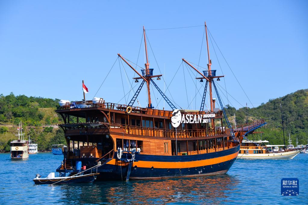這是5月12日在印度尼西亞拉布安巴焦海邊拍攝的一艘掛著(zhù)2023年?yáng)|盟峰會(huì )標志的游船。