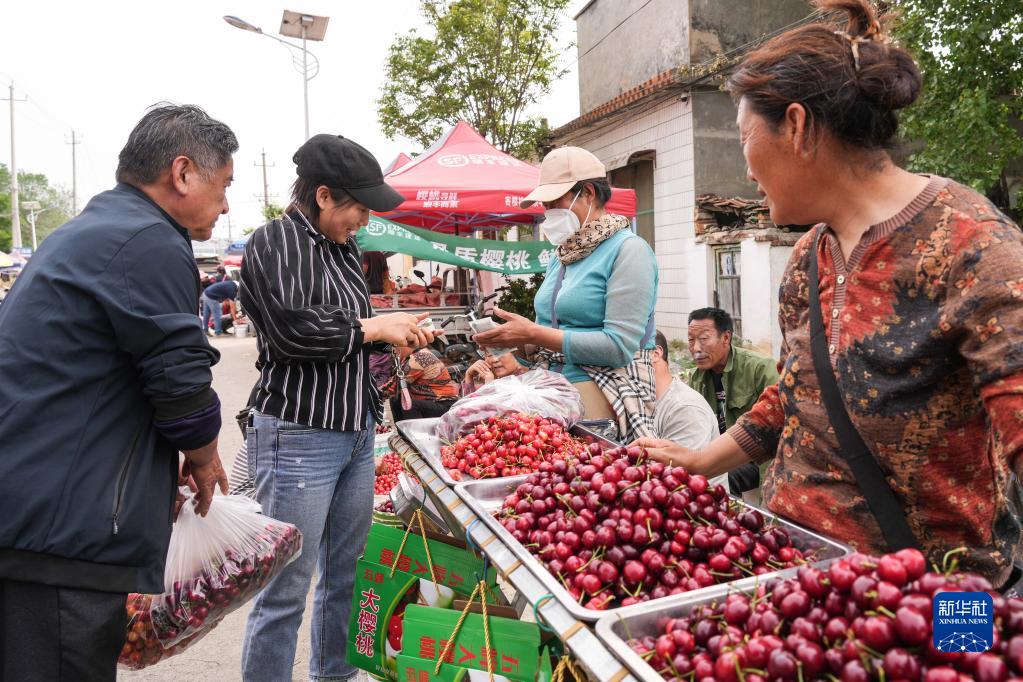5月12日,五峰山街道果農在市場(chǎng)銷(xiāo)售櫻桃。