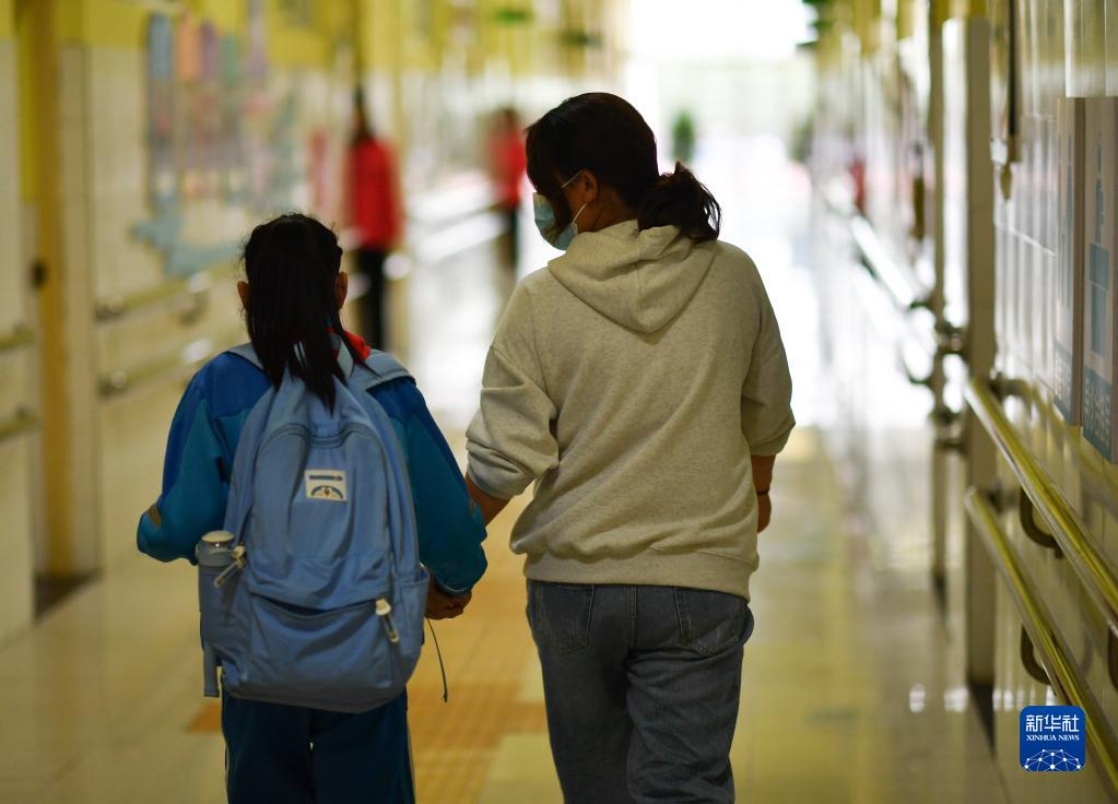 5月9日,在陜西省渭南市特殊教育學(xué)校,王鴿(右)陪同女兒趙懿菲步入教室。