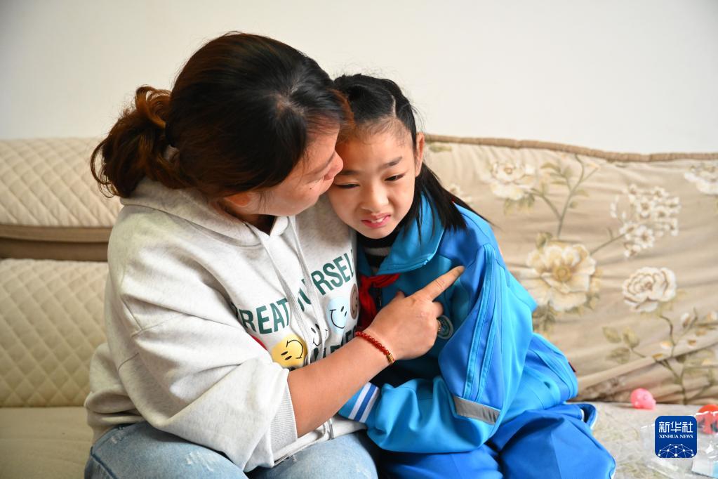 放學(xué)回到家后,趙懿菲依偎在媽媽?xiě)牙铮?月9日攝)。