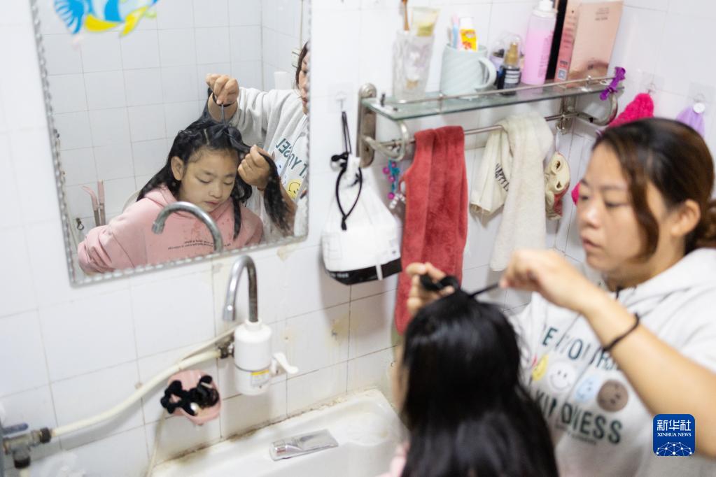 5月11日,在陜西省渭南市家中,王鴿協(xié)助小懿菲洗臉梳頭。