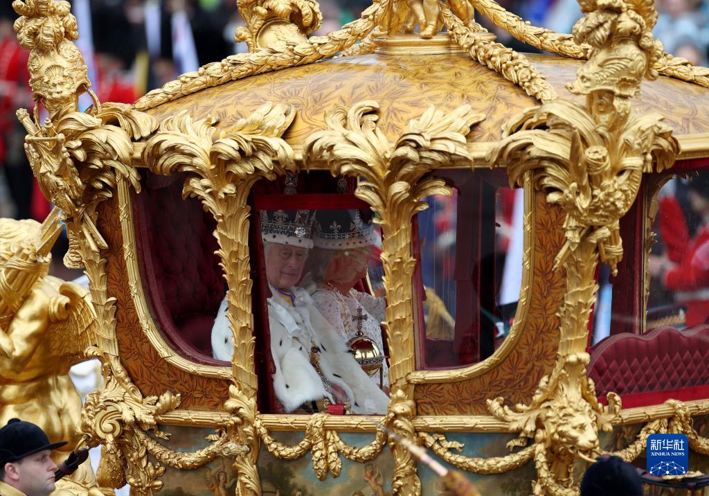 5月6日,在英國倫敦,英國國王查爾斯三世和王后卡米拉乘馬車(chē)從威斯敏斯特教堂返回白金漢宮。