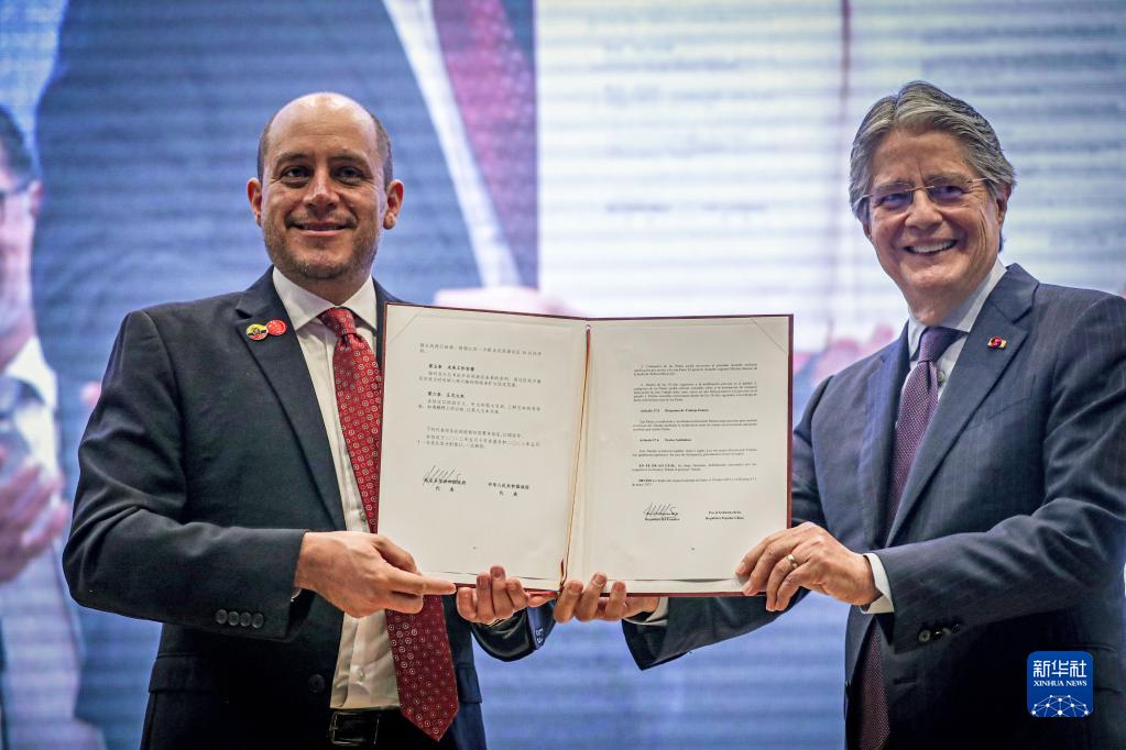 5月10日,厄瓜多爾總統拉索(右)與厄瓜多爾生產(chǎn)、外貿、投資和漁業(yè)部部長(cháng)普拉多在厄瓜多爾基多展示中厄自貿協(xié)定文件。