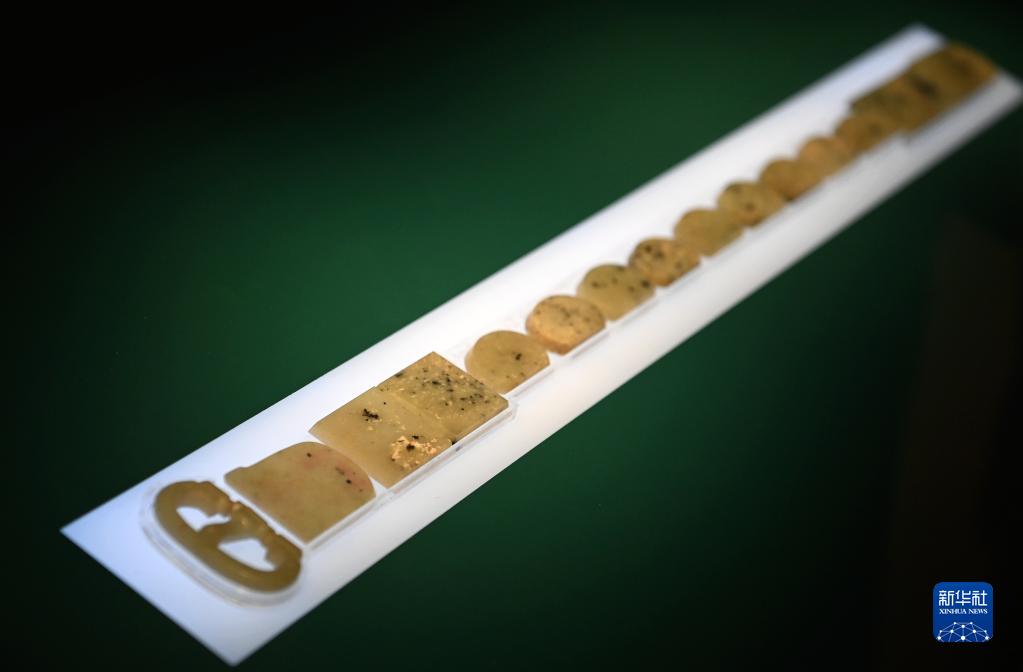 這是在陜西歷史博物館拍攝的骨咄玉帶銙(5月11日攝)?!肮沁汀奔寸孢土_,是位于今塔吉克斯坦和阿富汗之間的中亞小國,史籍記載與唐王朝交往密切。