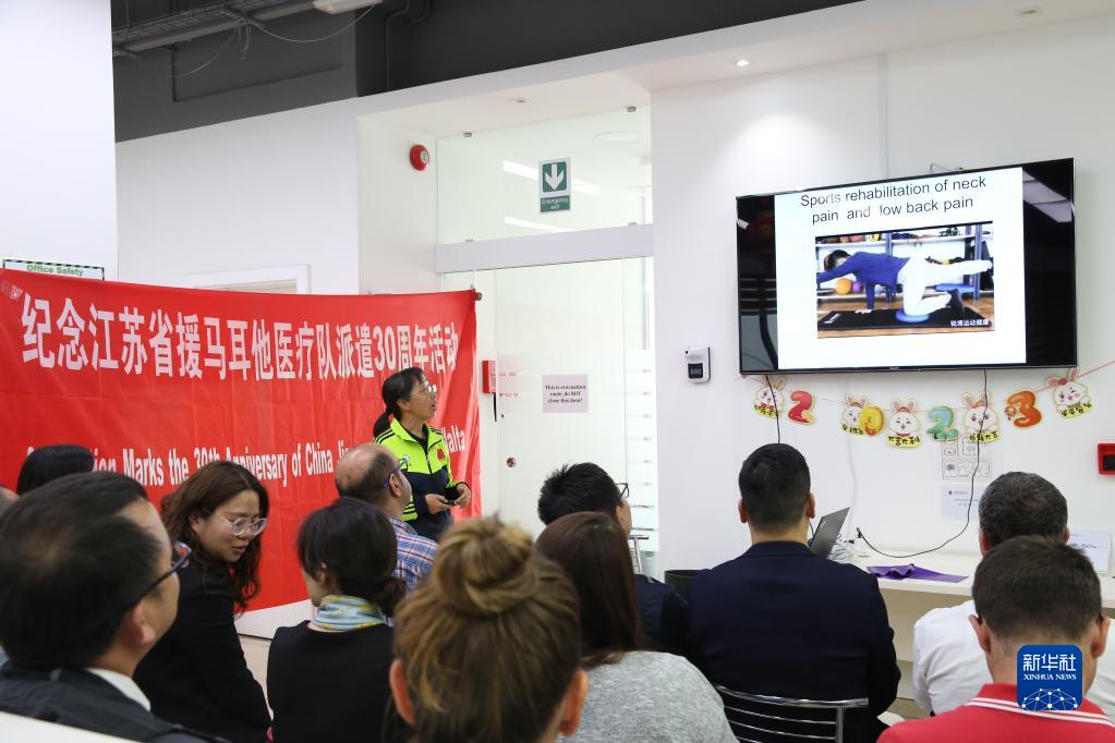 5月12日,在馬耳他馬爾薩什洛克,中國第18期援馬耳他醫療隊隊員邢雪梅做關(guān)于頸腰痛康復治療的講座。