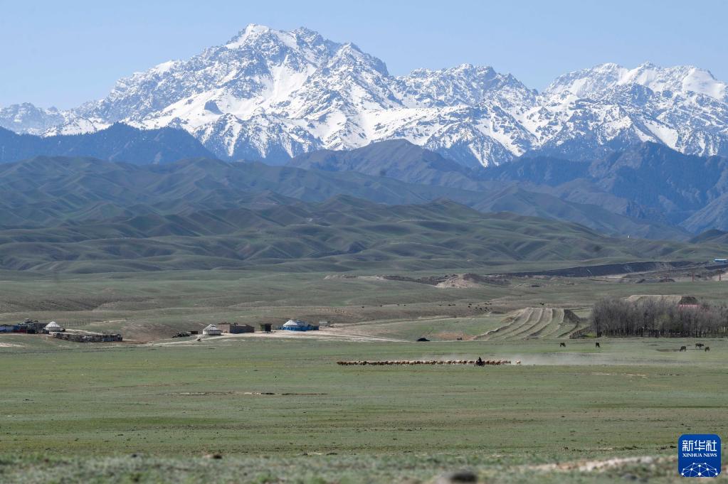 這是在由克拉瑪依市獨山子區通往山區的獨庫公路旁拍攝的牧場(chǎng)(5月10日攝)。