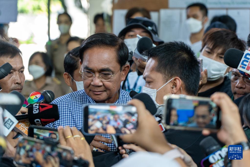 5月14日,泰國總理巴育(中)在曼谷一處投票站接受媒體采訪(fǎng)。