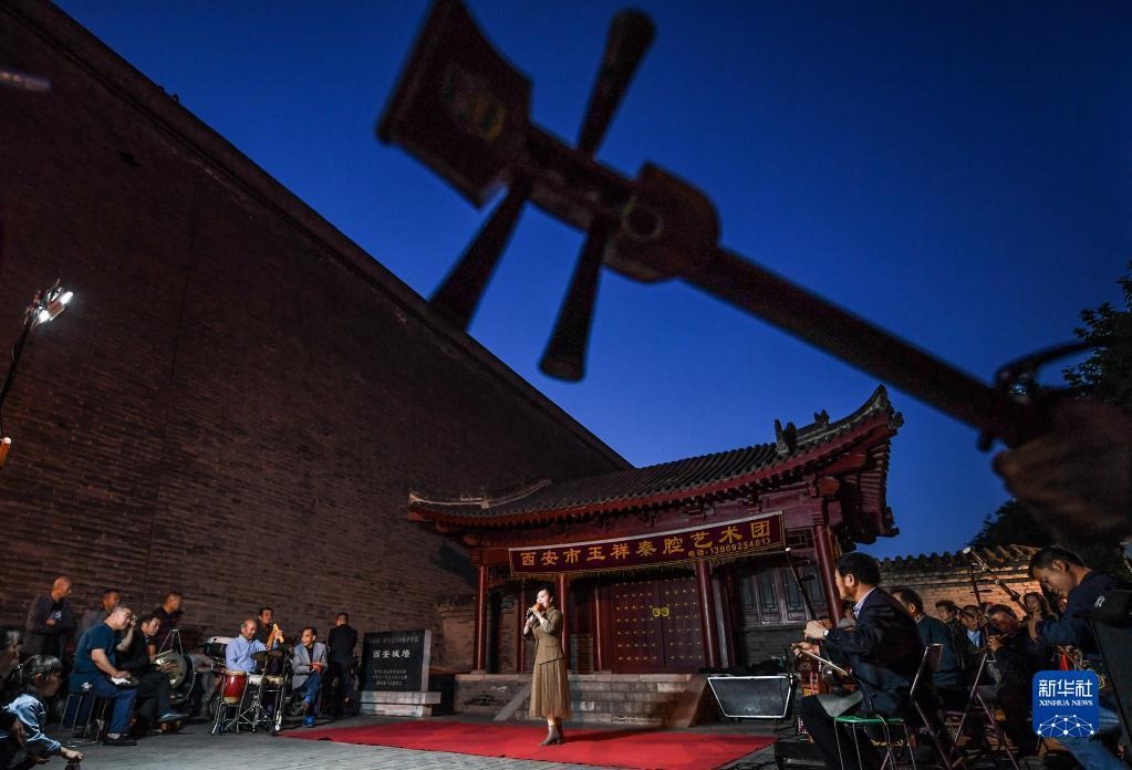 2023年5月12日,西安市玉祥秦腔藝術(shù)團成員在西安城墻玉祥門(mén)外表演秦腔。