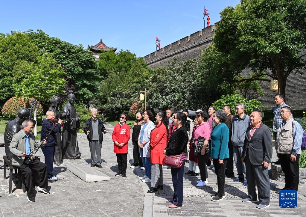2023年5月12日,西安市清風(fēng)合唱團在西安城墻下的環(huán)城公園演唱歌曲《八百里大秦川》。