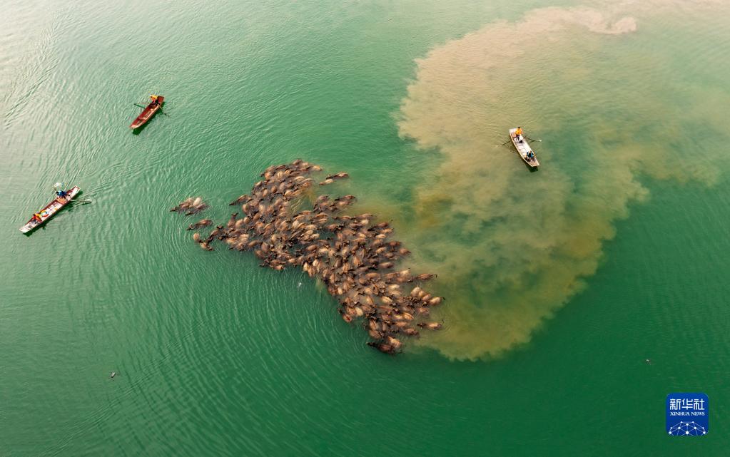 每年4-10月,在四川省南充市蓬安縣相如鎮油房溝村嘉陵江段,成群結隊的水牛在船只的護送引導下,清晨從岸邊結隊游上江心島啃食青草,黃昏又下水回游上岸歸欄,成為當地一道獨特的景觀(guān),吸引不少游客前來(lái)觀(guān)看。