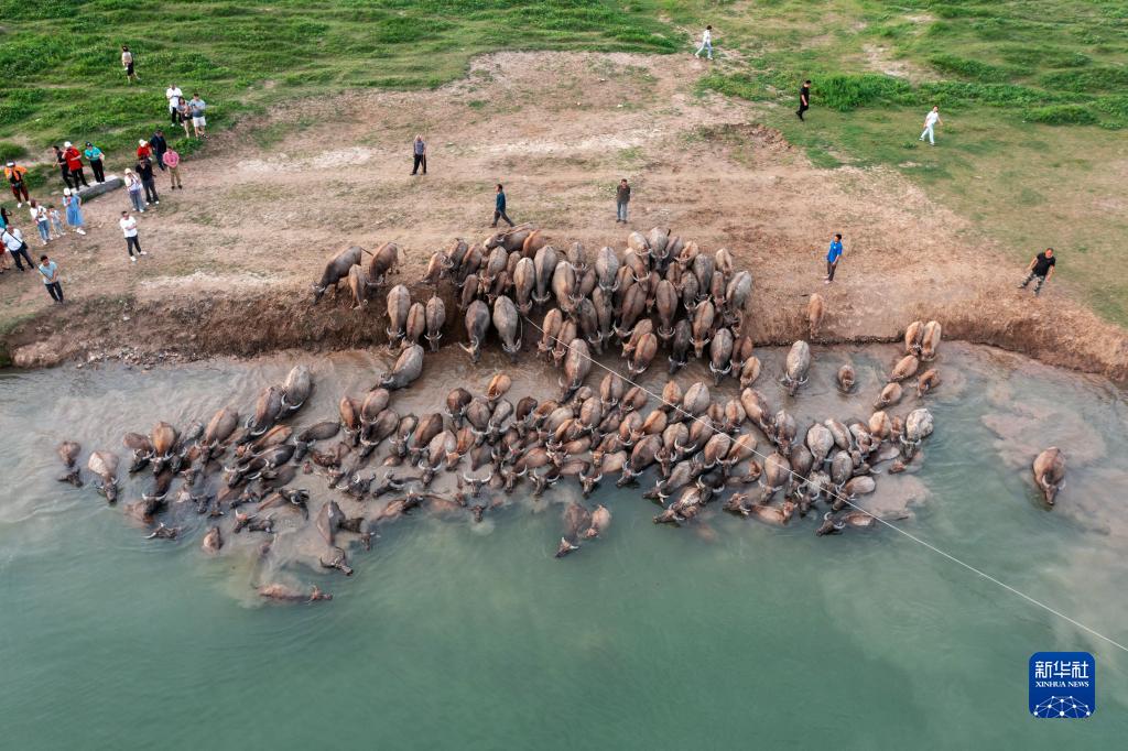 每年4-10月,在四川省南充市蓬安縣相如鎮油房溝村嘉陵江段,成群結隊的水牛在船只的護送引導下,清晨從岸邊結隊游上江心島啃食青草,黃昏又下水回游上岸歸欄,成為當地一道獨特的景觀(guān),吸引不少游客前來(lái)觀(guān)看。