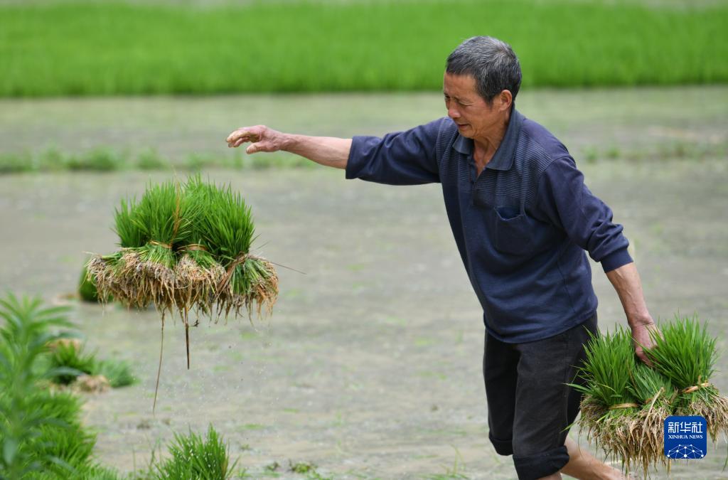 5月14日,村民在貴州省黔東南苗族侗族自治州岑鞏縣思旸鎮新安村農田里拋水稻秧苗。