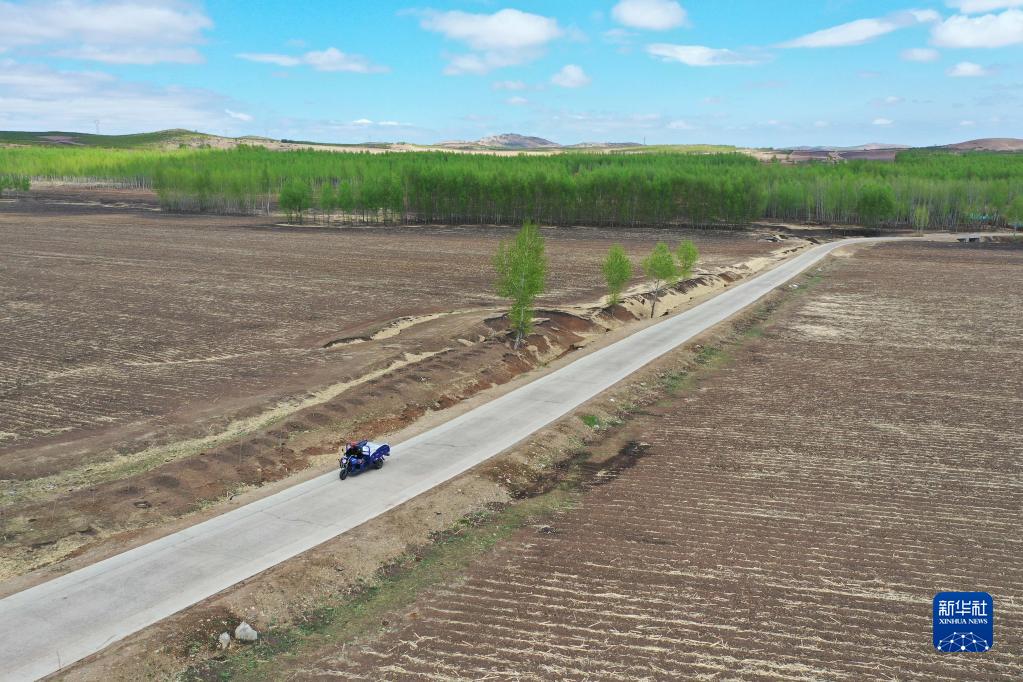 5月13日,于慶柱駕駛裝有快遞的三輪車(chē)行駛在回村的路上(無(wú)人機照片)。
