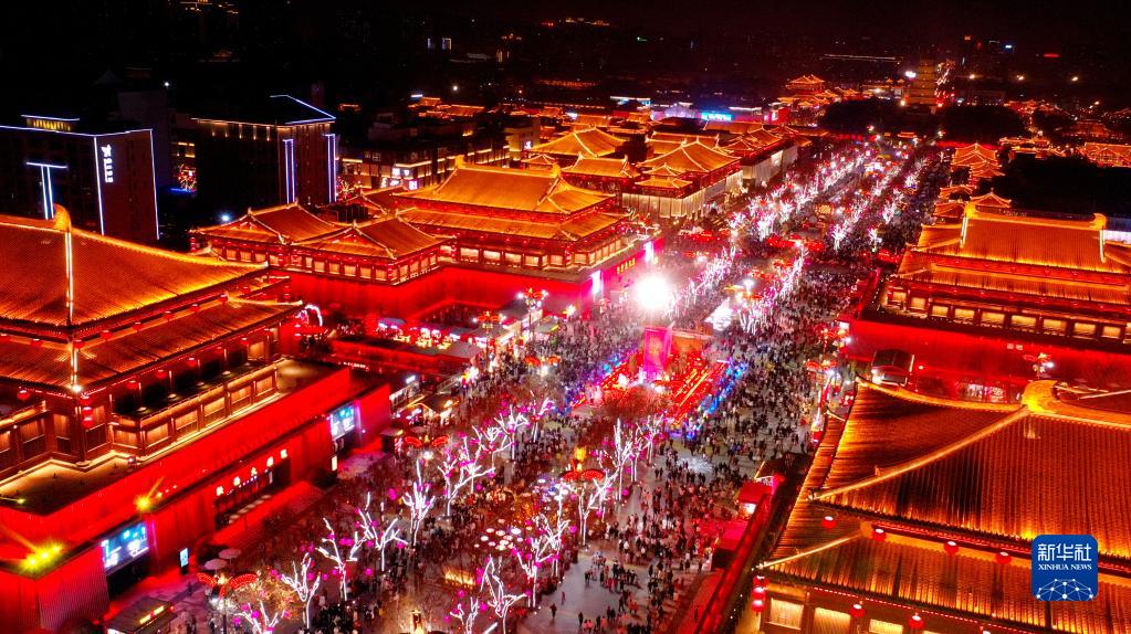 西安大唐不夜城步行街區(1月28日攝,無(wú)人機照片)。