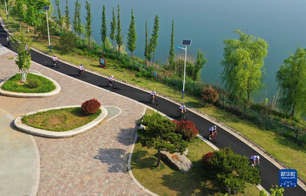 5月14日,市民在青島市即墨區環(huán)秀街道一個(gè)公園騎行(無(wú)人機照片)。