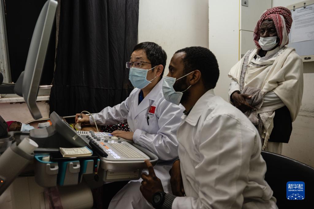 5月9日,在厄立特里亞首都阿斯馬拉的奧羅特醫院,醫療隊超聲科醫生王曉(左)為患者做檢查。