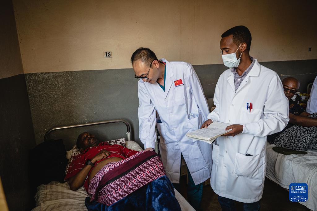 5月9日,在厄立特里亞首都阿斯馬拉的哈利貝特醫院,醫療隊泌尿外科醫生李龔龍(中)為患者做檢查。