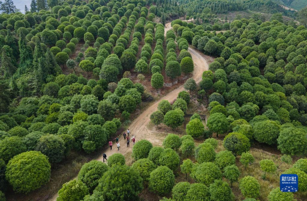 5月14日,李秀雄一家和工人走在四川省榮縣東興鎮長(cháng)興林場(chǎng)(無(wú)人機照片)。