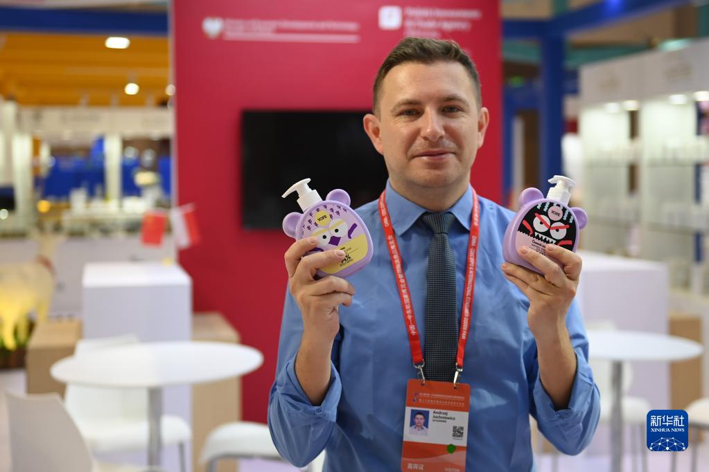 5月16日,在中東歐展館,企業(yè)代表在展示來(lái)自波蘭的日用消費品。