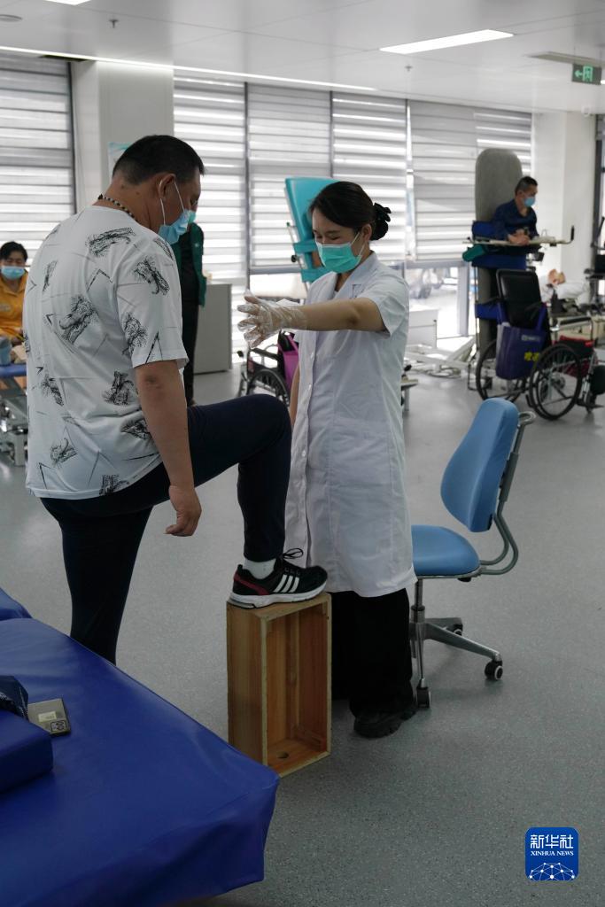 5月16日,在江蘇省鎮江市潤州區黎明社區衛生服務(wù)中心康復訓練中心,患者在醫務(wù)人員陪同下進(jìn)行康復訓練。黎明社區衛生服務(wù)中心的“康復聯(lián)合病房”為上級醫院下轉患者提供全程、連續康復治療。