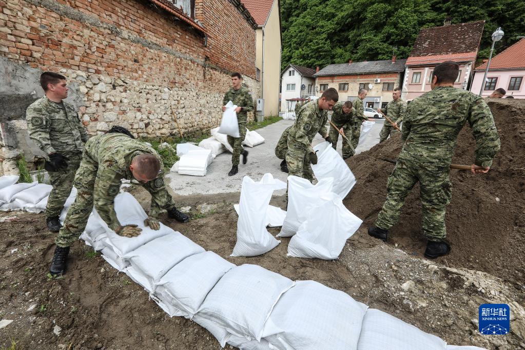 5月15日,在克羅地亞科斯塔伊尼察,士兵筑起攔水壩阻擋暴漲的烏納河水。