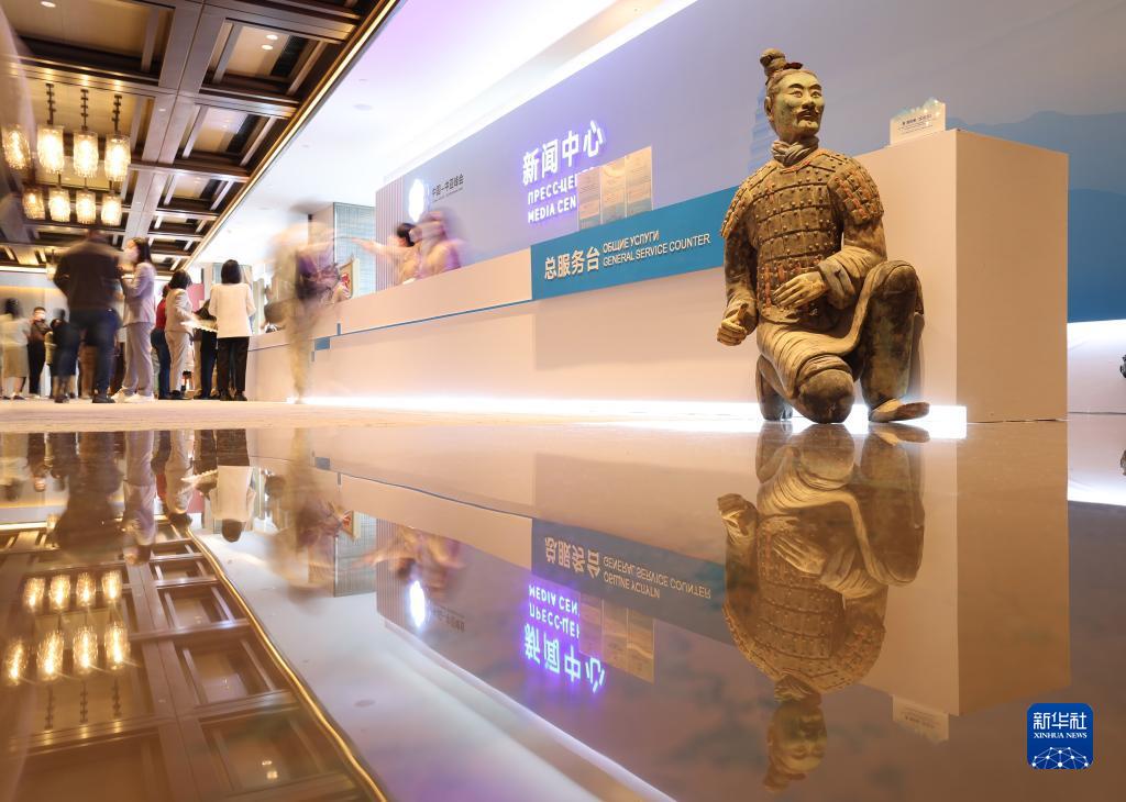 這是中國-中亞峰會(huì )新聞中心總服務(wù)臺旁的兵馬俑擺件(5月16日攝)。