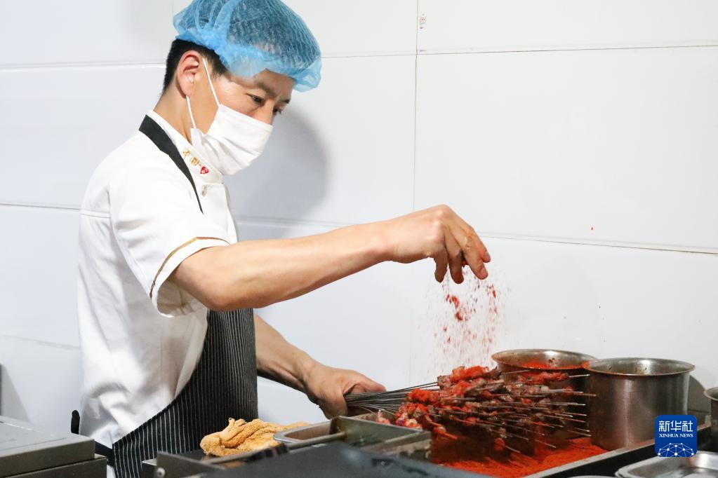5月12日,在嘉峪關(guān)市的一家烤肉店,廚師正在烤肉。