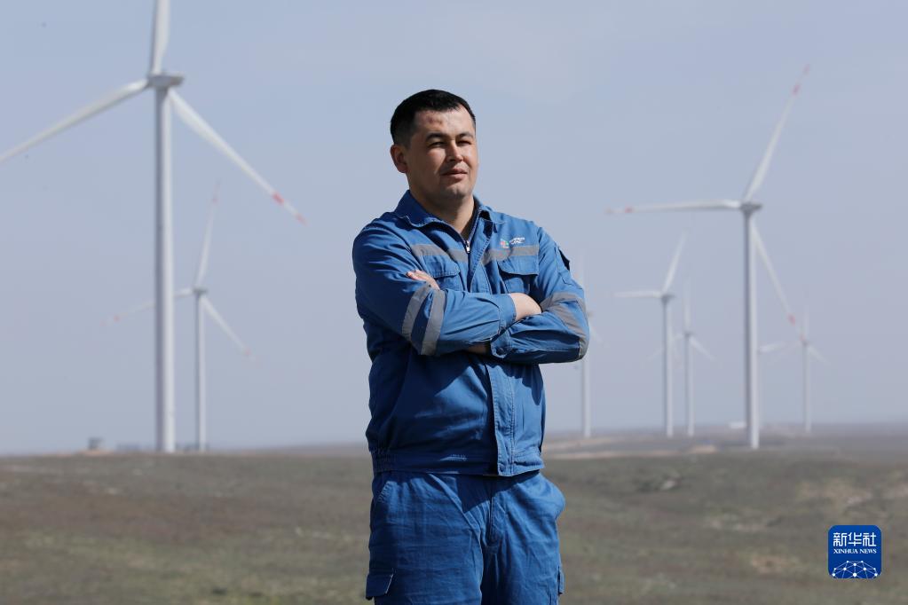 馬克薩特·阿比爾加濟耶夫曾是當地磷礦場(chǎng)的電力工程師,風(fēng)電項目的建設給他帶來(lái)很大震撼。據他回憶,2019年5月2日,風(fēng)電項目的第一臺渦輪風(fēng)力發(fā)電機運抵札納塔斯,小鎮居民很少見(jiàn)過(guò)如此龐然大物,一個(gè)風(fēng)機葉片就需要加長(cháng)貨車(chē)才能運輸,非常壯觀(guān)。阿比爾加濟耶夫意識到,哈薩克斯坦風(fēng)能資源充沛,但掌握風(fēng)電技術(shù)的專(zhuān)業(yè)人員很少,這一清潔能源的未來(lái)十分光明。2020年,三十而立的他作出了擁抱“未來(lái)”的決定——辭去磷礦場(chǎng)的工作,加入札納塔斯風(fēng)電項目。他成為了一名見(jiàn)習風(fēng)電檢修工,開(kāi)始跟著(zhù)中國師傅們學(xué)習風(fēng)電檢修技術(shù)。