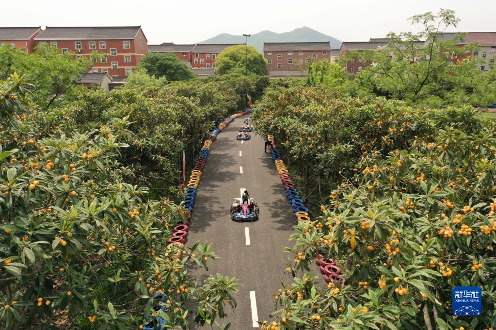 5月17日,游客在塘棲鎮的枇杷園中體驗卡丁車(chē)比賽(無(wú)人機照片)。