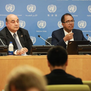 5月16日,在位于紐約的聯(lián)合國總部,聯(lián)合國《2023年世界經(jīng)濟形勢與展望》年中更新報告領(lǐng)銜作者哈米德·拉希德(右)在報告發(fā)布會(huì )上作介紹。