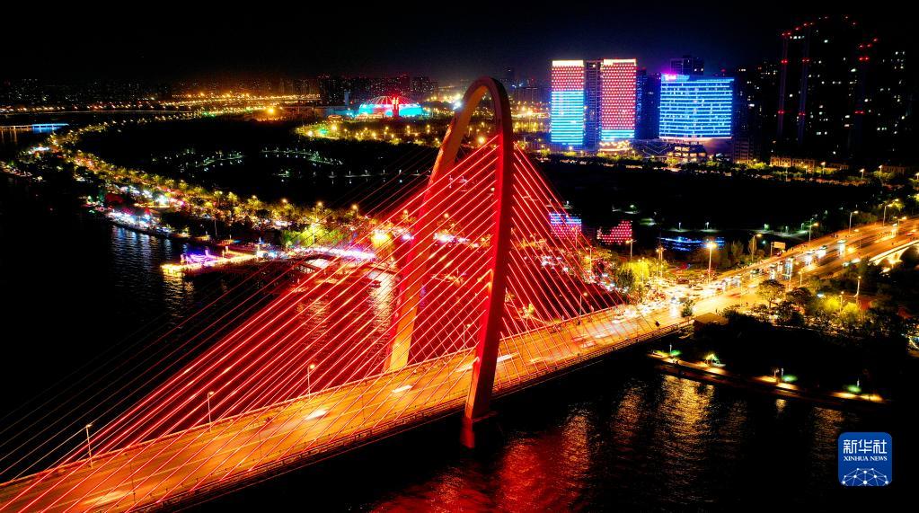位于西安浐灞生態(tài)區的歐亞大橋夜景(5月1日攝,無(wú)人機照片)。