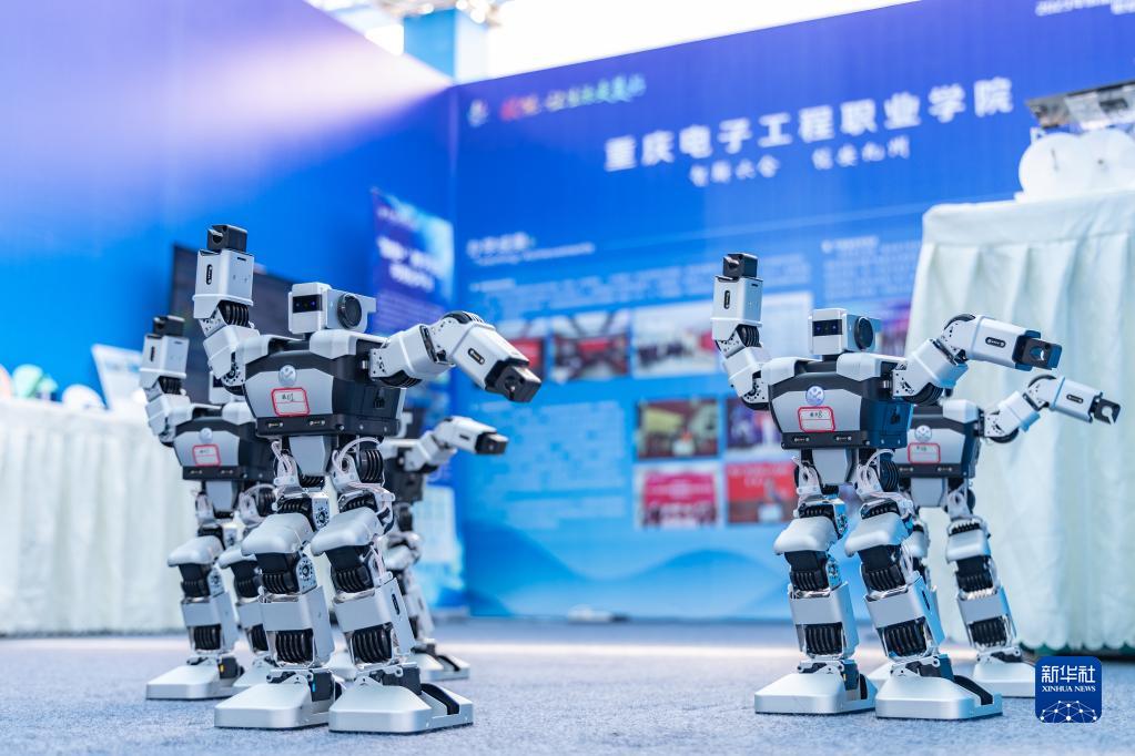 5月17日,在重慶市永川區舉行的2023年成渝地區雙城經(jīng)濟圈職業(yè)教育活動(dòng)周辦學(xué)成果展上, 重慶電子工程職業(yè)學(xué)院研發(fā)的舞蹈機器人在現場(chǎng)演示。