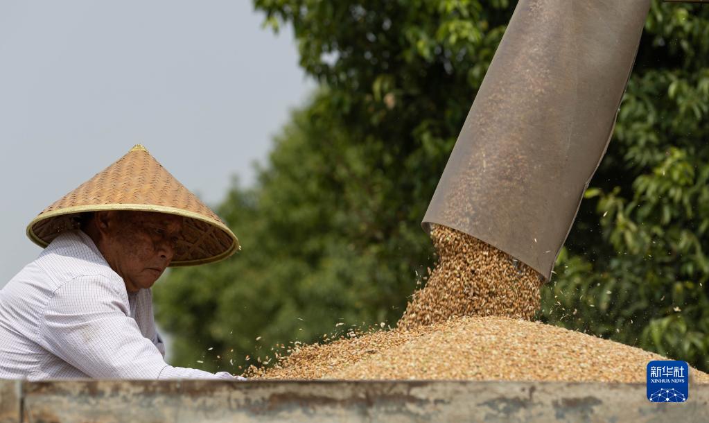 5月17日,在廣漢市小漢鎮團結村,收割機收獲的小麥顆粒歸倉。